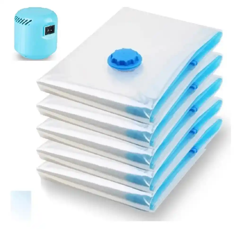 Set de 5 Bolsas al Vacío 50 x 70 cm con Bomba Eléctrica Optimiza el espacio de tu hogar con este práctico set de 5 bolsas al vacío tamaño grande (70 x 100 cm), ideales para guardar ropa, cobijas, edredones, almohadas y más. Incluye bomba eléctrica para una extracción de aire rápida y sin esfuerzo. Características: 📦 Contiene 5 bolsas al vacío tamaño 50 x 70 cm ⚡ Bomba eléctrica incluida, fácil de usar y eficiente 🔒 Sistema de sellado hermético con válvula de alta resistencia 🧳 Reduce el volumen hasta un 75%, ahorrando espacio 🛡️ Protege contra polvo, humedad, moho e insectos ♻️ Material reutilizable, grueso y resistente 👚 Ideal para ropa, cobijas, edredones, almohadas y prendas de temporada Perfecto para organizar closets, mudanzas o almacenamiento a largo plazo. ¡Más espacio y mejor organización en minutos! ✨