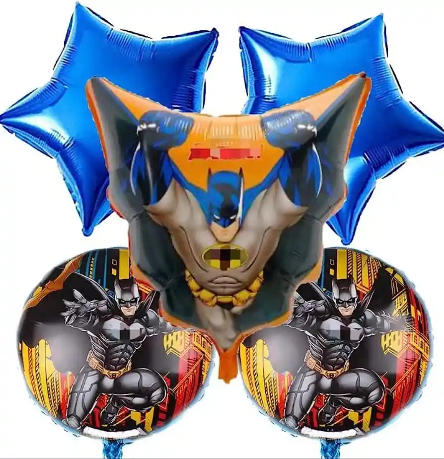 Set 5 Globos Metalizados BATMAN NEGRO/NARANJA 5 unidades •Figura Batman: Alto:98cm Ancho:51cm •2 Globos Personaje Batman 45 cm , cada uno •2 Globos Estrellas: 45 cm , cada uno Papel de aluminio