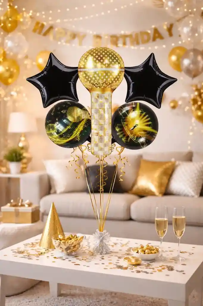 Decoración temática musical con globos metalizados Ideal para fiestas de cumpleaños, karaoke, eventos musicales o celebraciones temáticas. Este set incluye un llamativo globo en forma de micrófono dorado acompañado de globos decorativos que crean un ambiente moderno y elegante para tu fiesta. ✨ Contenido del paquete: * 1 Globo metalizado micrófono dorado * 2 Globos metalizados estrella negra * 2 Globos metalizados redondos con diseño musical •Total: 5 globos metalizados Importante: •Los globos se entregan desinflados. •Solo incluye los 5 globos metalizados. La cinta, el portaglobos, base y demás accesorios son únicamente para ambientar la imagen y no están incluidos. Perfectos para decorar: * Cumpleaños * Fiestas temáticas de música * Karaoke * Eventos juveniles * Decoración de mesa principal. •1 Globo Microfono 70x45cm •2 Globos Estrella 45x45cm •2 Globos Redondo 45x45cm
