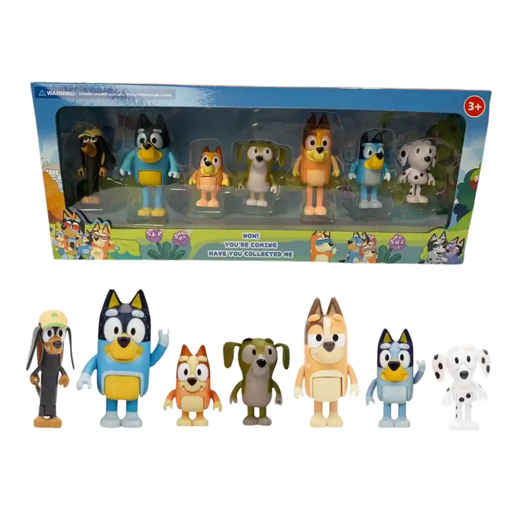 *¡¡BIENVENIDO A TONATEK!!* 1. CARACTERISTICAS DE LA COMPRA: 1.1 Esta compra incluye: - 1 Set 7 Figuras Coleccionables Bluey Y Sus Amigos 1.2 Características del producto: Set de figuras coleccionables de Bluey que incluye varios personajes en una sola presentación. Ideal para niños y fanáticos de la serie, perfecto para jugar, decorar o coleccionar. Las figuras cuentan con buen nivel de detalle y tamaño práctico para manos pequeñas. Vienen en caja exhibidora, lista para regalo.
