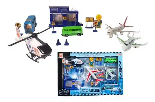 • Set aeropuerto para niños • Incluye 2 Aviones, 1 Helicóptero , 2 vehículos, 3 señales, 1 edificio, 1 muñeco y 2 conos • Material en plástico