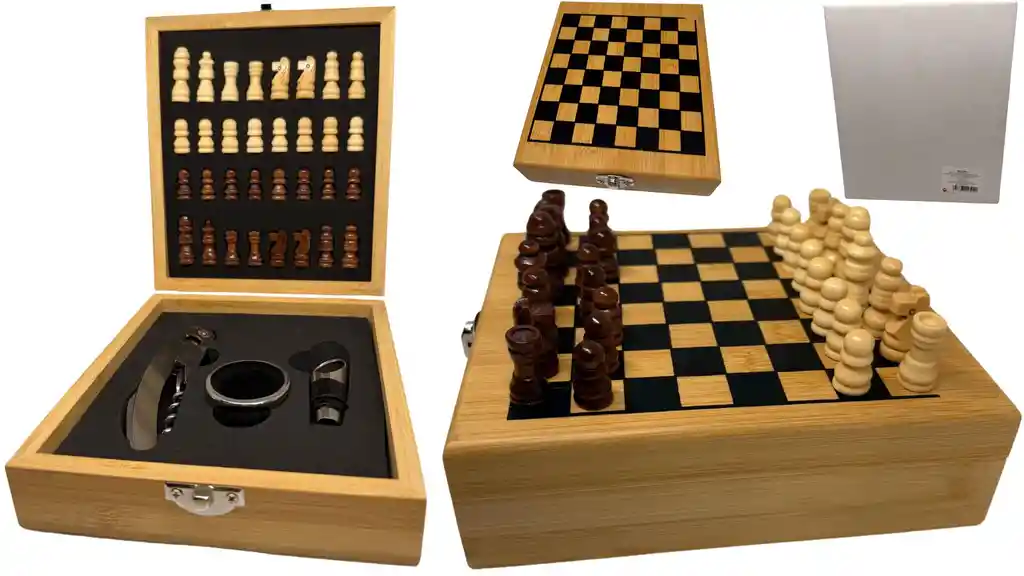 Ref. 8295-2 Este elegante set combina la estrategia del ajedrez con la funcionalidad de tres accesorios esenciales para disfrutar en reuniones y momentos especiales. Ideal como regalo o como pieza decorativa para el hogar u oficina, incluye tablero plegable con piezas completas y herramientas de uso práctico: un destapador, un sacacorchos y un cortador de cápsulas. Diseño compacto y sofisticado, fácil de transportar y almacenar. Perfecto para amantes del vino y del ajedrez. CARACTERÍSTICAS: Tablero de ajedrez con diseño elegante Tamaño: 15 cm de largo x 17 cm de alto Incluye: 1 Sacacorchos 1 Destapador 1 Cortador de cápsulas Material resistente y duradero Ideal como regalo o decoración Uso práctico y recreativo ¿QUÉ INCLUYE TU PRODUCTO? 1 Set de ajedrez completo 1 Sacacorchos 1 Destapador 1 Cortador de cápsulas Un producto decorativo y funcional, ideal para regalar o disfrutar en casa. ZZZZZZZZZZZZZZZZZZZZZZZZZZZZZZZZZZZZZZZZZZZZZZZZZZZZZZZZZZZZZZZZZZZZZZ MÁS DETALLES: Condición: Nuevo MAS INFORMACIÓN DE NOSOTROS Somos INVERSIONES MAZUGI. Importadores directos desde china Cumplimos con distribuir a todo el país. Estamos ubicados en Bogotá, somos tienda virtual y física PRODUCTOS AL POR MAYOR Y DETALLE Somos una empresa importadora y comercializadora de productos de Alta Calidad de varias categorías como: belleza, tecnología, hogar, juguetería, cuidado personal, entre otras.