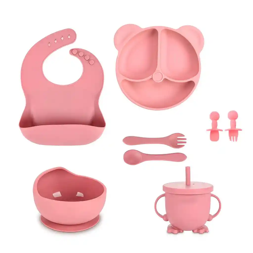 Haz que la hora de la comida sea divertida y sin desorden con este completo set de alimentación de silicona premium. Diseñado especialmente para etapas de alimentación complementaria y método BLW, este kit incluye todo lo necesario para que tu bebé aprenda a comer de forma independiente y segura. Fabricado en silicona de grado alimenticio, es suave con las encías del bebé y extremadamente duradero. El plato y el bowl cuentan con una potente base de succión que se adhiere a la mayoría de las sillas de comer, evitando derrames accidentales. Además, el babero ajustable con bolsillo recolector mantiene la ropa limpia, y el vaso con pitillo tipo pingüino es ideal para la transición a líquidos. Fácil de limpiar, apto para lavavajillas y microondas. Ficha Técnica: Material: Silicona Plato: Diseño "Smiling Face" con divisiones (20x20x3.2 cm / 153g). Bowl: Modelo "Escargot" con base de succión (12x8 cm / 150g). Babero: Silicona ajustable con bolsillo amplio (30x23 cm / 117g). Vaso: Diseño "Penguin Cup" con asas y pitillo (11x10 cm / 100g). Cubiertos 1: Par de cuchara y tenedor de silicona largos (14.5x3.3 cm / 57g). Cubiertos 2: Par de cuchara y tenedor tipo "Cartoon" ergonómicos (8x4.5 cm / 61g). Resistencia: Apto para microondas, congelador y lavavajillas. Políticas de Garantía: Este producto cuenta con una garantía de 30 días calendario por defectos de fabricación, tales como fallas en las ventosas de succión o defectos en el material de silicona al momento de la entrega; para hacerla válida, el set debe devolverse en su empaque original. La garantía no cubre daños por cortes con objetos punzantes, mordeduras profundas (desgaste natural por uso) o quemaduras por contacto directo con fuego. Es indispensable presentar el comprobante de compra para procesar cualquier solicitud. Se recomienda lavar profundamente antes del primer uso.