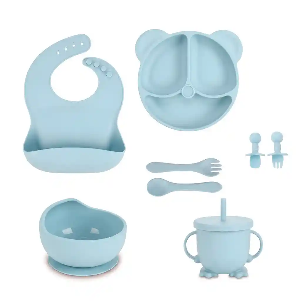 Haz que la hora de la comida sea divertida y sin desorden con este completo set de alimentación de silicona premium. Diseñado especialmente para etapas de alimentación complementaria y método BLW, este kit incluye todo lo necesario para que tu bebé aprenda a comer de forma independiente y segura. Fabricado en silicona de grado alimenticio, es suave con las encías del bebé y extremadamente duradero. El plato y el bowl cuentan con una potente base de succión que se adhiere a la mayoría de las sillas de comer, evitando derrames accidentales. Además, el babero ajustable con bolsillo recolector mantiene la ropa limpia, y el vaso con pitillo tipo pingüino es ideal para la transición a líquidos. Fácil de limpiar, apto para lavavajillas y microondas. Ficha Técnica: Material: Silicona Plato: Diseño "Smiling Face" con divisiones (20x20x3.2 cm / 153g). Bowl: Modelo "Escargot" con base de succión (12x8 cm / 150g). Babero: Silicona ajustable con bolsillo amplio (30x23 cm / 117g). Vaso: Diseño "Penguin Cup" con asas y pitillo (11x10 cm / 100g). Cubiertos 1: Par de cuchara y tenedor de silicona largos (14.5x3.3 cm / 57g). Cubiertos 2: Par de cuchara y tenedor tipo "Cartoon" ergonómicos (8x4.5 cm / 61g). Resistencia: Apto para microondas, congelador y lavavajillas. Políticas de Garantía: Este producto cuenta con una garantía de 30 días calendario por defectos de fabricación, tales como fallas en las ventosas de succión o defectos en el material de silicona al momento de la entrega; para hacerla válida, el set debe devolverse en su empaque original. La garantía no cubre daños por cortes con objetos punzantes, mordeduras profundas (desgaste natural por uso) o quemaduras por contacto directo con fuego. Es indispensable presentar el comprobante de compra para procesar cualquier solicitud. Se recomienda lavar profundamente antes del primer uso.