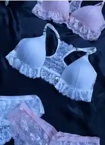 Bralette con copa, sin varilla, con cómodo broche delantero y con detalle de encaje posterior. Contiene panty tipo semicachetero en encaje y algodón.