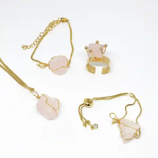 El cuarzo rosado es conocida como la piedra del amor incondicional y la paz infinita, libera las penas y las emociones no expresadas, facilita el perdón y la auto aceptación, permite tener mas confianza en ti mismo. Extrae suavemente las energías negativas reemplazándolas por vibraciones amorosas Esta es una imagen referencia. El tono, la forma y el tamaño de los cristales pueden variar. Material pulsera: Rodio Material Collar y tobillera: Acero inoxidable Material aretes y anillo: Latón con baño de oro 24K INCLUYE: Collar + manilla + tobillera + anillo + aretes