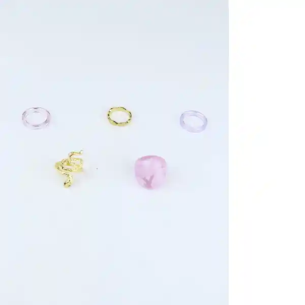 Set Fuxia Contiene 5 Unidades: Anillos Fantasía. Dos Anillos en Fantasía Dorada. Dos Anillos en Pasta. Un Anillo en Pasta.