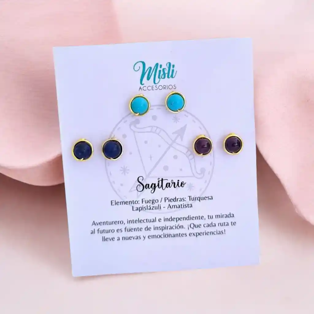 ¡Descubre la combinación perfecta entre estilo y astrología con nuestro set de aretes en piedras y cuarzos naturales, cada uno diseñado según tu signo zodiacal! Las piedras asociadas al signo SAGITARIO son: - Turquesa: Sanación y bienestar. - Lapislázuli: Objetividad y comunicación. - Amatista: Creatividad e intuición. Estos aretes no solo complementarán tu outfit, sino que también reflejarán tu personalidad única y tu conexión con el cosmos. Desde el apasionado Aries hasta el enigmático Piscis, cada par está elaborado para celebrar tu individualidad y elevar tu estilo a nuevas alturas. ¡Haz una declaración de moda con cada par y deja que tu luz interior brille con cada uso! Nos mantenemos a tu disposición para resolver cualquier consulta o brindarte información adicional que requieras. ¡No dudes en contactarnos, estamos para ayudarte en todo lo que necesites!