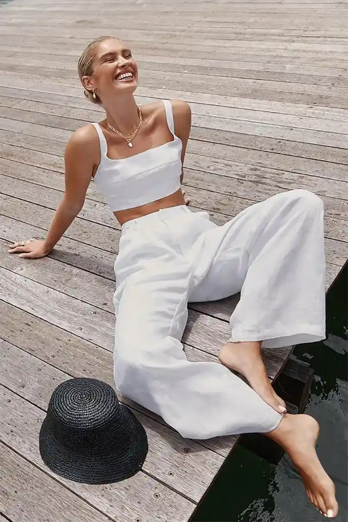 Set de 2 piezas pantalon y top en lino con tiras ajustables y resorte en espalda, pantalón con horma increible, top con elastico para mayor horma, lúcelo fantástico en climas cálidos. Por favor revisar medida en cintura del pantalón para que puedas guiarte y escoger la talla indicada Medida cintura talla S 66m Medida cintura talla M 68cm Material: Lino Cambios por talla