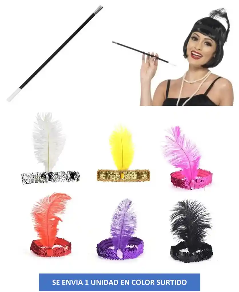 Set de accesorios para Disfraz de Flapper Gatsby de Mujer de los Años 20. Incluye 1 balaca y 1 cigarrillo de la época. El color de la balaca se envía según disponibilidad de colores