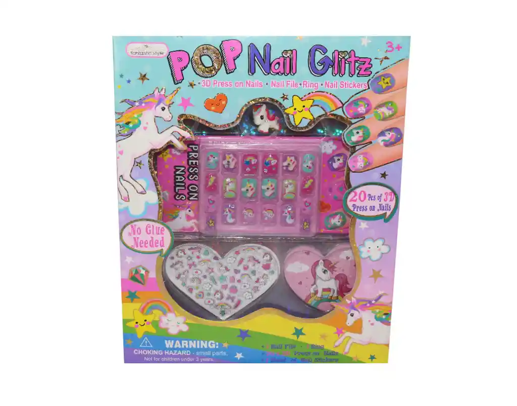 NOMBRE: SET BELLEZA UÑAS UNICORNIO CAJA DESCRIPCION: Espectacular Set de Uñas Unicornio ideal para que las niñas pasen horas interminables de diversión decorando las uñas. Este Set de uñas es una gran manera de animar el juego creativo y desarrollo de las habilidades motoras y de imaginación y permite que los niños expresen su personalidad con un toque de brillo y color. Incluye 20 uñas decoradas, lima, sticker para decorar y anillo. - Dimensiones del Empaque: 19,7 X 24,4 X 3,6 centímetros - Disponibilidad permanente - Despachos a nivel nacional - Tiempo de entrega aproximado 3 a 4 días hábiles contados a partir del día hábil siguiente al pedido. La plataforma te dará un tiempo de entrega mas preciso al momento de concretar la compra. Estamos atentos a resolver cualquier inquietud que tengas después de revisar las fotos y descripción del producto. JUGUETELANDIA más de 30 años ofreciendo diversión. Fabricante: BEI XIN TOYS FACTORY Importador: Plasticos Asociados SA Recomendaciones: Requiere de la supervisión directa de un adulto, puede contener partes pequeñas, riesgo de asfixia o ahogamiento, no destinar este juguete para menores por debajo de la edad establecida en la etiqueta. Edad mínima sugerida: 3 Años Lote: Dato variable. Se puede verificar en el sticker que trae el producto físico. Fecha de fabricación: Dato variable. Se puede verificar en el sticker que trae el producto físico.