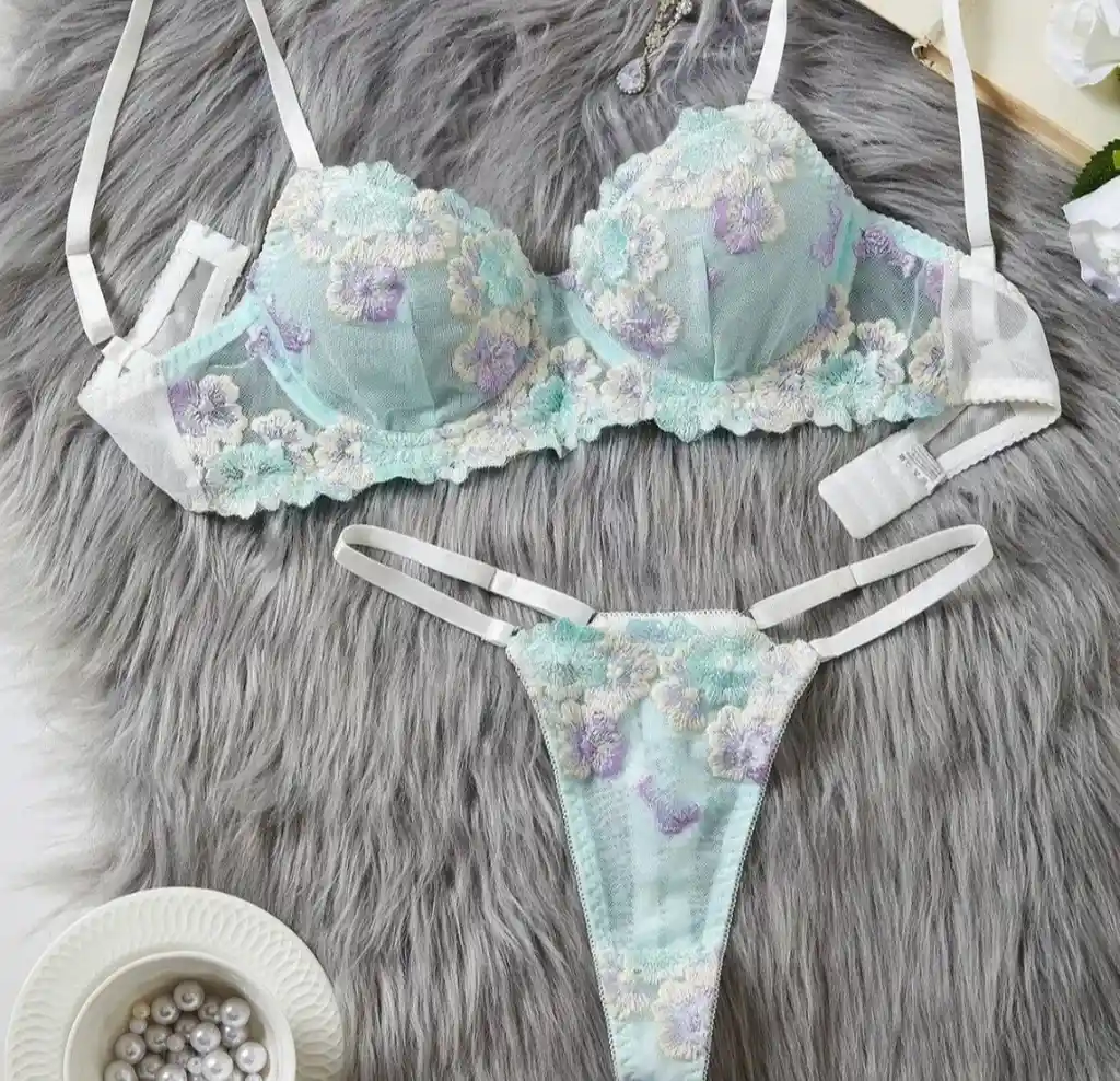 Conjunto de lencería con diseño en tonos pasteles con bordados florales sobre malla transparente que resaltan tu feminidad. ✔️ Sostén de copa con aros, realza tu figura con un ajuste perfecto. ✔️ Tirantes satinados ajustables, para mayor comodidad y estilo. ✔️ Panty tipo tanga con detalles florales y ajuste delicado. ✔️ Diseño romántico y exclusivo, ideal para ocasiones especiales o para sentirte increíble cada día.