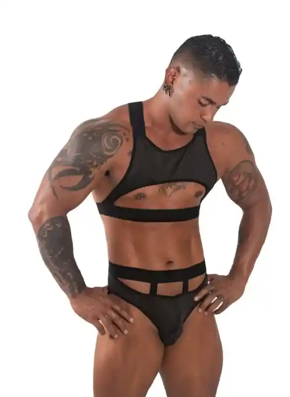 Eleva tu confianza al máximo nivel. Este conjunto de dos piezas combina un arnés de diseño geométrico con un slip de corte atlético, diseñado para resaltar cada ángulo de tu figura. Elaborado en polilicra de alta resistencia, ofrece un ajuste tipo «segunda piel» que no pierde su forma. Diseño: Top tipo arnés con abertura frontal y espalda en Y. Material: Polilicra elástica, suave al tacto y de secado rápido. Versatilidad: Perfecto para sesiones de fotos, eventos de noche o para sentirte imparable en la intimidad. Especificaciones del Producto: Material: Poli licra (80% Poliéster / 20% Elastano) que garantiza confort y frescura. Construcción: Costuras reforzadas y elásticos de alta densidad que definen la silueta sin lastimar la piel. Guía de Tallas: S – M: Para contexturas delgadas a atléticas. L – XL: Para contexturas robustas o musculosas Color: Negro Mate Profundo.