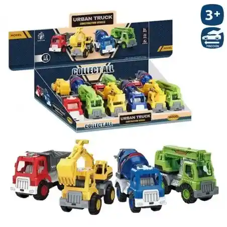 Set completo de 4 camiones medianos, excavadora, mezcladora, volquete y otro más. Perfecto para jugar en cualquier superficie.