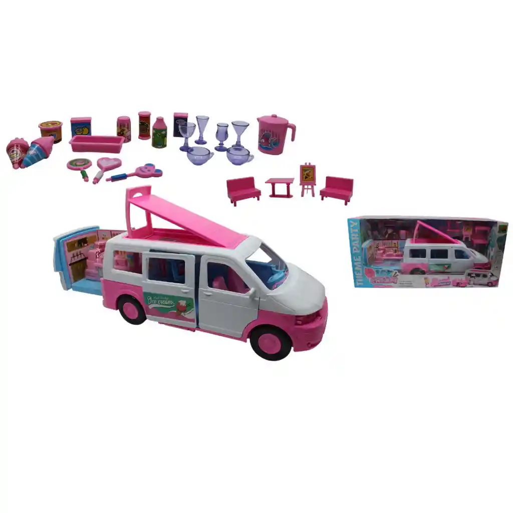 Este hemoso carro de helados Incluye: Carro de helados, con apertura de puertas, techo y baul 2 conos 1 mesa + sillas + tablero de precios 3 Paletas set de vajilla + tetera Cajas de snacks, galletas, leche, jugos para una tarde de te inolvidable