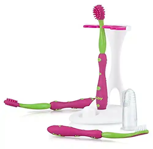 El set de cuidado bucal Nuby es un sistema de 4 etapas que tiene un tamaño perfecto para ayudar a proteger los dientes primarios de su bebé. Estos cepillos de dientes para principiantes Nuby promueven el desarrollo temprano de una buena higiene dental. Las cerdas de cada cepillo están diseñadas especialmente para un niño. El resultado de esta especial atención al detalle es un producto que su hijo puede usar con facilidad. El masajeador de silicona está diseñado para bebés menores de 3 meses y está hecho de silicona extra suave con la comodidad de su bebé en mente. El cuerpo hueco hace que este masajeador sea fácil de deslizar sobre el dedo de los padres para usarlo en el bebé. Tres superficies diferentes permiten al padre múltiples opciones para limpiar y suavizar las encías sensibles. El cepillo de masaje # 1 está diseñado para bebés mayores de 3 meses. Ha sido diseñado específicamente para sentirse suave en las encías del bebé. Permite a los padres cepillarse y masajear las encías suavemente. El cepillo de masaje # 2 está diseñado para bebés mayores de 11 meses. Este cepillo masajea y ayuda a limpiar durante el proceso de dentición. Además, esta edad es el momento ideal para enseñarle a su hijo hábitos adecuados de cepillado y fomentar el comienzo de una buena salud bucal. El cepillo de cerdas de nylon está diseñado para bebés con dientes. Pregúntele a su médico o dentista cuándo cambiar al cepillo de nylon suave una vez que comience la dentición. Y recuerde, hasta que su hijo tenga la destreza para hacerlo solo, debe continuar con un cepillado adicional, etc. hasta que sea mayor. Todas estas piezas tienen un lugar en el soporte incluido que es ideal para un uso conveniente. Caracteristicas: -Etapa 1: masajeador de silicona extra suave y limpiador de encías para encías delicadas recién nacidas -Etapa 2: masajeador de encías blandas para encías viejas y dientes recién erupcionados -Etapa 3: masajea y ayuda a limpiar las encías y los dientes durante el proceso de dentición -Etapa 4: las suaves cerdas de nylon limpian suavemente los dientes nuevos del bebé -Sin BPA -Uso desde los 0 meses hasta los 6 años. -1 masajeador y 3 cepillos diseñados para las diversas etapas del desarrollo oral -Promueve el desarrollo temprano de una buena higiene dental. -El masajeador se desliza fácilmente sobre el dedo de los padres -Los cepillos están dimensionados para que el niño los sostenga fácilmente -Conveniente soporte para todas las piezas