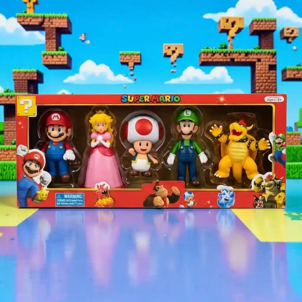 Este pack de lujo reúne a los 5 personajes más icónicos de la saga en una presentación impecable, ideal tanto para jugar como para exhibir en tu repisa favorita. Cada figura ha sido diseñada con detalles fieles al videojuego, capturando la esencia y personalidad de cada héroe y villano. ¿Qué incluye el set? Mario: El héroe bigotudo listo para la acción. Luigi: El inseparable y valiente hermano de verde. Princesa Peach: Con su elegancia característica y vestido detallado. Toad: El leal habitante del reino con su icónico sombrero de hongo. Bowser: El imponente rey de los Koopas con un diseño robusto y detallado. Características Principales: Material de Alta Calidad: Fabricados en PVC/Plástico resistente, duradero y seguro para niños. Figuras Articuladas: Permiten diferentes poses para recrear tus escenas favoritas de los juegos. Tamaño Ideal: Figuras de aproximadamente 12 cm, el tamaño perfecto para manos pequeñas o vitrinas de colección.