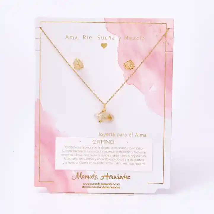 El set Citrino es un amuleto de luz para atraer alegría, confianza y prosperidad. 💛✨ El citrino, conocido como la piedra de la abundancia, te acompaña como un recordatorio de que mereces recibir: oportunidades, éxito y bienestar. Su tono dorado suave y los detalles delicados hacen que se vea elegante y luminoso, perfecto para elevar tu look mientras sostienes tus metas con una energía bonita y segura. Características de tu Producto: - Tipo: Set de joyería. Incluye Collar y Aretes a juego. - Collar: Cadena fina dorada con dije central de jade con detalle tipo “envoltura” en alambre dorado - Aretes: Par de aretes dorados a juego con piedra central (diseño delicado) - Estilo: Elegante, minimalista y natural ideal para uso diario o looks sofisticados - Significado: Equilibrio, enfoque, calma mental, prosperidad y nuevos proyectos - Ideal para: Autoregalo, regalo para amigas/mamá, nuevos comienzos, metas y proyectos - Cuidado recomendado: Evita agua, perfumes y cremas guarda las piezas separadas para proteger el acabado y la piedra - Longitud de la cadena: 45 cm. - La cadena y los apliques plateados cuentan con Baño de Oro 18k. - Elaborado con Cuarzos 100% Naturales