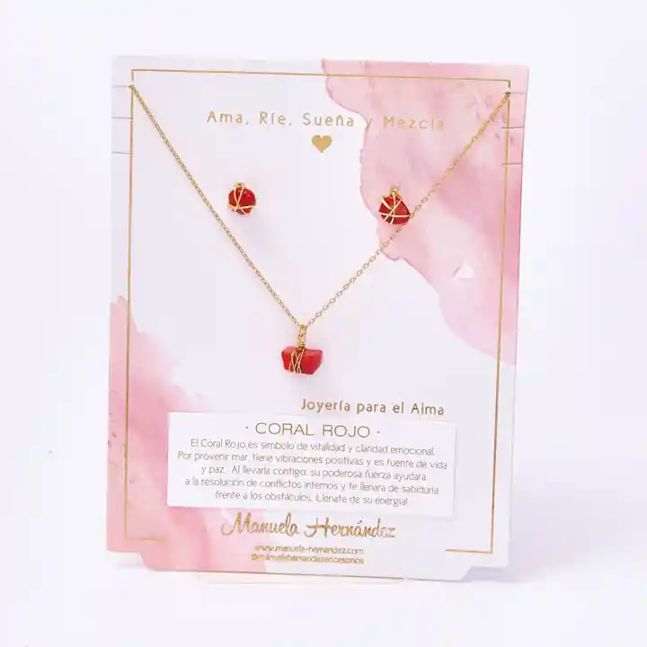 El set Coral Rojo es pura fuerza con corazón. ❤️✨ El coral rojo, asociado a vitalidad y fortaleza emocional, te acompaña como un amuleto para recuperar energía, sostenerte con valentía y avanzar con determinación. Su tono intenso y los detalles dorados lo hacen poderoso y femenino a la vez: perfecto para recordarte que tu luz se enciende cuando te eliges… y que dentro de ti hay una fuerza increíble. Características de tu Producto: - Tipo: Set de joyería. Incluye Collar y Aretes a juego. - Collar: Cadena fina dorada con dije central de jade con detalle tipo “envoltura” en alambre dorado - Aretes: Par de aretes dorados a juego con piedra central (diseño delicado) - Estilo: Elegante, minimalista y natural ideal para uso diario o looks sofisticados - Significado: Equilibrio, enfoque, calma mental, prosperidad y nuevos proyectos - Ideal para: Autoregalo, regalo para amigas/mamá, nuevos comienzos, metas y proyectos - Cuidado recomendado: Evita agua, perfumes y cremas guarda las piezas separadas para proteger el acabado y la piedra - Longitud de la cadena: 45 cm. - La cadena y los apliques plateados cuentan con Baño de Oro 18k. - Elaborado con Cuarzos 100% Naturales