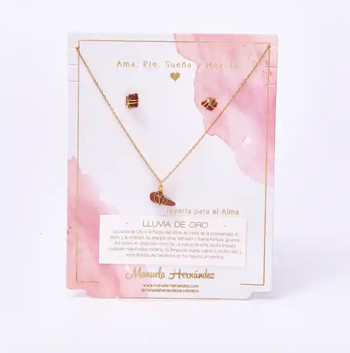 El set Lluvia de Oro se siente como un “sí” del universo: luz, abundancia y buena energía cayendo sobre ti. ✨💛 Su piedra de Lluvia de oro y los detalles dorados crean un look cálido y elegante, perfecto para recordarte que mereces prosperidad, oportunidades y momentos bonitos. Llévalo como amuleto de brillo interior y confianza: para atraer lo bueno, sostener tus metas y caminar con una vibra más alta. Características de tu Producto: - Tipo: Set de joyería. Incluye Collar y Aretes a juego. - Collar: Cadena fina dorada con dije central de jade con detalle tipo “envoltura” en alambre dorado - Aretes: Par de aretes dorados a juego con piedra central (diseño delicado) - Estilo: Elegante, minimalista y natural ideal para uso diario o looks sofisticados - Significado: Equilibrio, enfoque, calma mental, prosperidad y nuevos proyectos - Ideal para: Autoregalo, regalo para amigas/mamá, nuevos comienzos, metas y proyectos - Cuidado recomendado: Evita agua, perfumes y cremas guarda las piezas separadas para proteger el acabado y la piedra - Longitud de la cadena: 45 cm. - La cadena y los apliques plateados cuentan con Baño de Oro 18k. - Elaborado con Cuarzos 100% Naturales