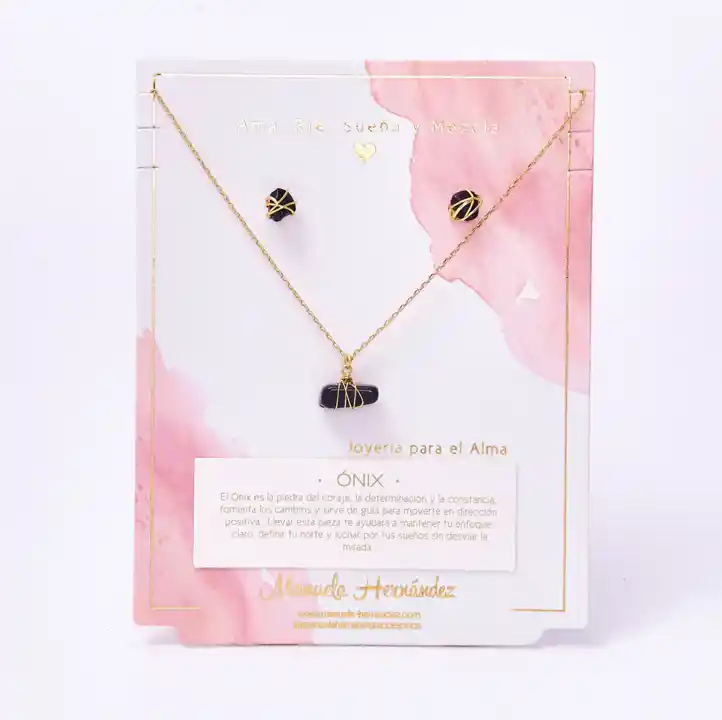 Cadena y apliques Dorados con Baño de Oro 18k. Elaborado con Ónix Natural. Longitud del collar: 45 cm. Incluye Collar y Aretes.