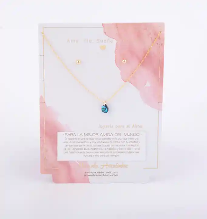 La Cadena y los apliques Dorados cuentan con Baño de Oro 18k. El Dije está elaborado con Cristal Swarovski. Incluye Aretes y Collar.