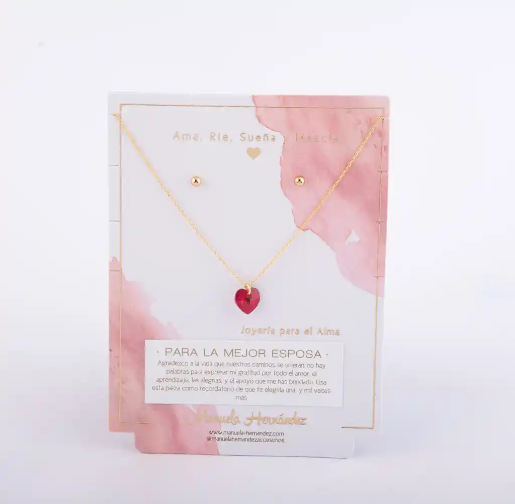 La Cadena y los apliques Dorados cuentan con Baño de Oro 18k. El Dije está elaborado con Cristal Swarovski. Incluye Aretes y Collar.