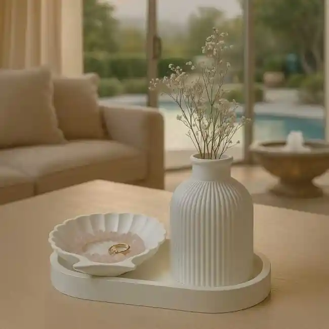 ✨ Estilo Glam / Elegante: Lujo sutil en cada detalle. Nuestros sets de decoración combinan acabados blanco, dorado y plata. Sofisticación para convertir cualquier rincón en una expresión de estilo y elegancia moderna. Decoración que combina un diseño moderno y acabados delicados para llenar tu hogar de estilo, paz y belleza. 🪄 USO / RECOMENDACIONES: ✨ Coloca este set en mesas auxiliares, repisas, estantes flotantes, escritorios o rincones especiales para dar un toque de diseño y armonía. 🕯️ Ideal para complementar con velas, libros decorativos, flores secas o bandejas decorativas. 🏠 Perfecto para salas, estudios, entradas, habitaciones o incluso baños modernos. 📸 También recomendado para sesiones de fotos o ambientaciones en redes sociales. ¡Ideal para regalar o renovar tus ambientes favoritos! 📏 Detalles del producto Incluye: 1 bandeja decorativa + 1 florero + 1 recipiente forma de concha Medidas aproximadas: Bandeja : 18 cm largo x 11 cm ancho Florero:11 cm alto Concha: 10 cm diámetro Color: Blanco Materiales: Cemento *No incluye flores