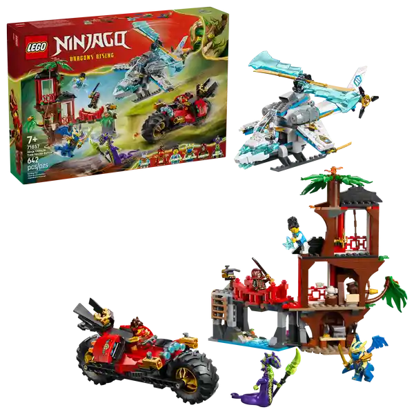 Contiene 642 Piezas. Ninjago Batalla de Vehículos Ninja Junto a la Casa Del Árbol Juguetes de Combate Casa Del Árbol Helicóptero Moto y 6 Minifiguras Set Construible Para Niños 71857.