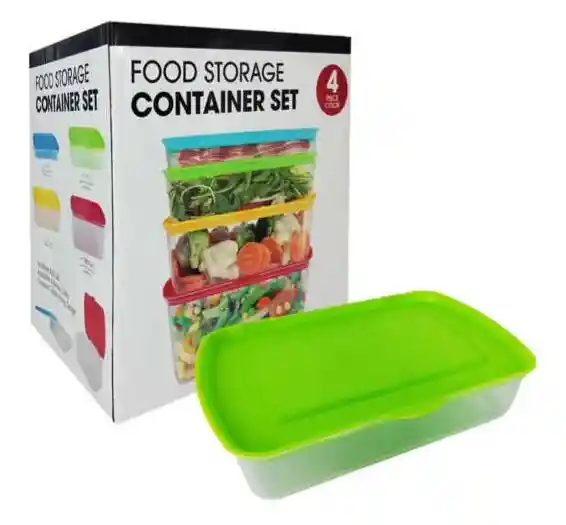 SET DE 4 CONTENEDORES CON TAPA RECTANGULARES PLÁSTICOS DE DIFERENTES TAMAÑO Y CAPACIDAD Set de 4 contenedores de plástico rectangular hermético con tapas de colores Esto los convierte en 4 contenedores súper prácticos y cómodos para su guardado y traslado. ESPECIFICACIONES: * Material: Plástico Libre de BPA * Apto para: Lavavajillas, Freezer. * Apto para consumir directo del contenedor. * Dimensiones: - 250ml 13cm*7,5cm*2,7cm peso: 65,5gr - 500ml 13cm*17,5cm*5cm peso: 75gr - 750ml 13cm*17,5cm*6cm peso: 87,5gr - 1000ml 13cm*17,5cm*7,5cm peso: 91gr PAQUETE INCLUYE: * 1 Set de 4 contenedores plásticos con tapa rectangular diferentes colores y capacidad.