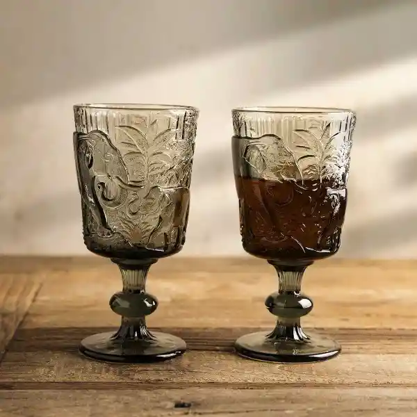 Set Contiene 2 Unidades. Cada Copa de 270 mL Presenta un Delicado Grabado de Elefantes en Relieve Aportando Una Textura Visual y Táctil Única Que se Convierte en el Centro de Atención. El Color Gris Traslúcido Añade un Aire de Modernidad y Misterio Alejándose Del Cristal Convencional Para Ofrecer Una Mesa Con Más Carácter. Fabricadas en Vidrio Resistente y Duradero Con un Peso Sólido de 04 Kg Por Pieza Que Garantiza Estabilidad y Una Sensación Premium al Tacto.