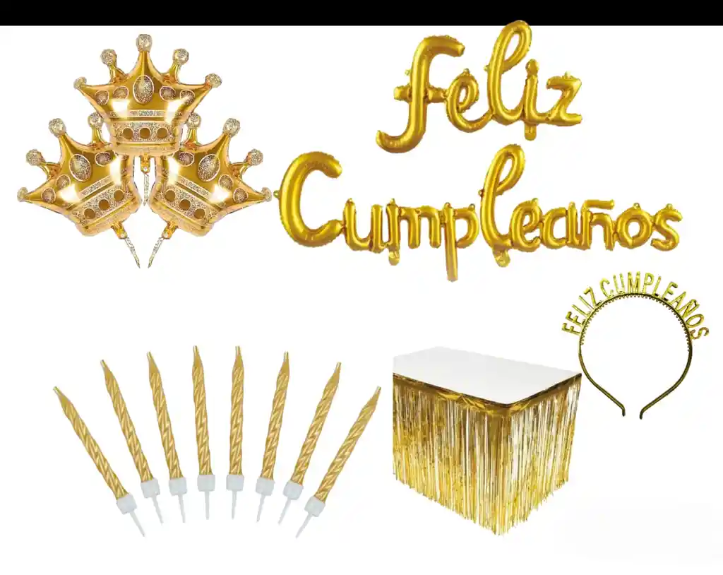 3 globo metalizado corona dorada 76x70 cms, Globo Letra Feliz Cumpleaños, Vela dorada x 8 Pcs, Tiara Feliz cumpleaños, Cortina dorada para mesa 2 metros de ancho x 1 metro de largo