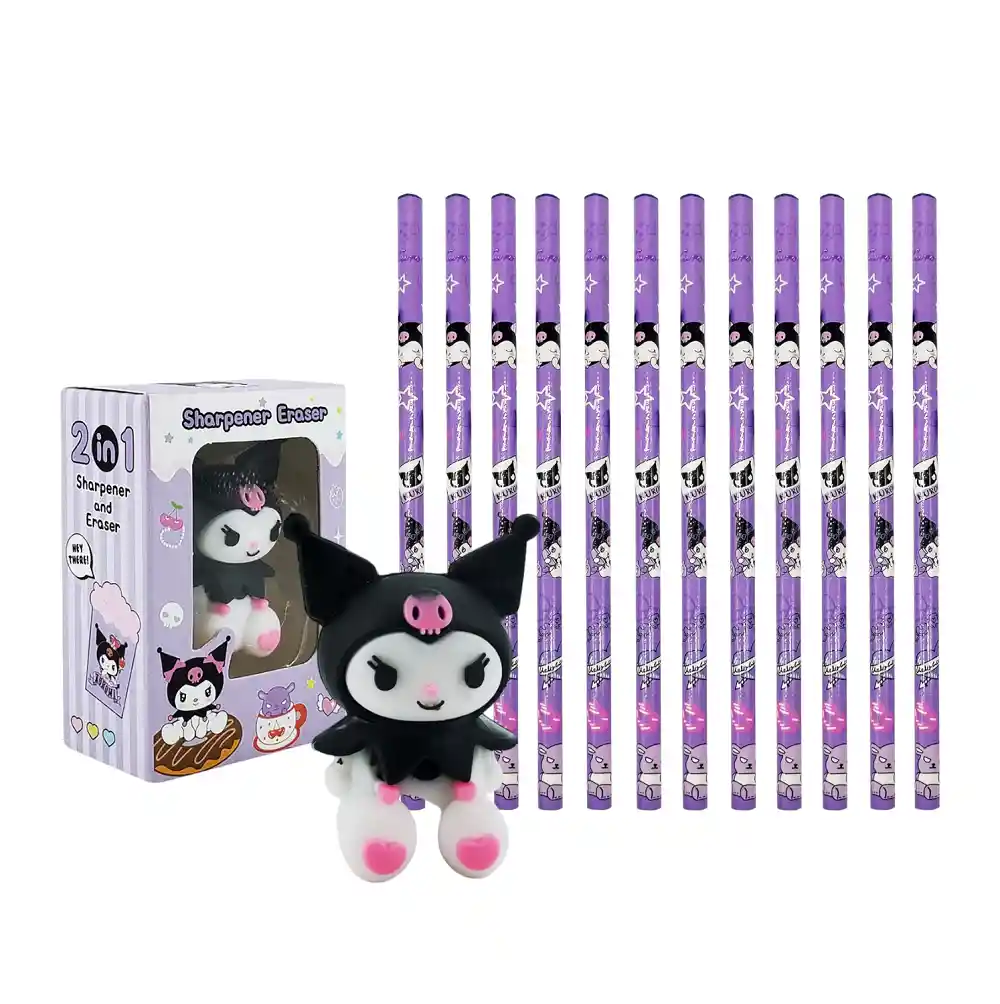 ¡Dale un toque kawaii a tu escritorio con el set Kuromi 2 en 1! Incluye un práctico borrador con sacapuntas integrado y una docena de lápices decorados con tus personajes favoritos. Perfecto para la escuela, la oficina o como regalo especial. Su diseño adorable y funcionalidad hacen que escribir, dibujar y corregir sea más divertido que nunca. ¡Haz que la magia Kuromi te acompañe en cada trazo!