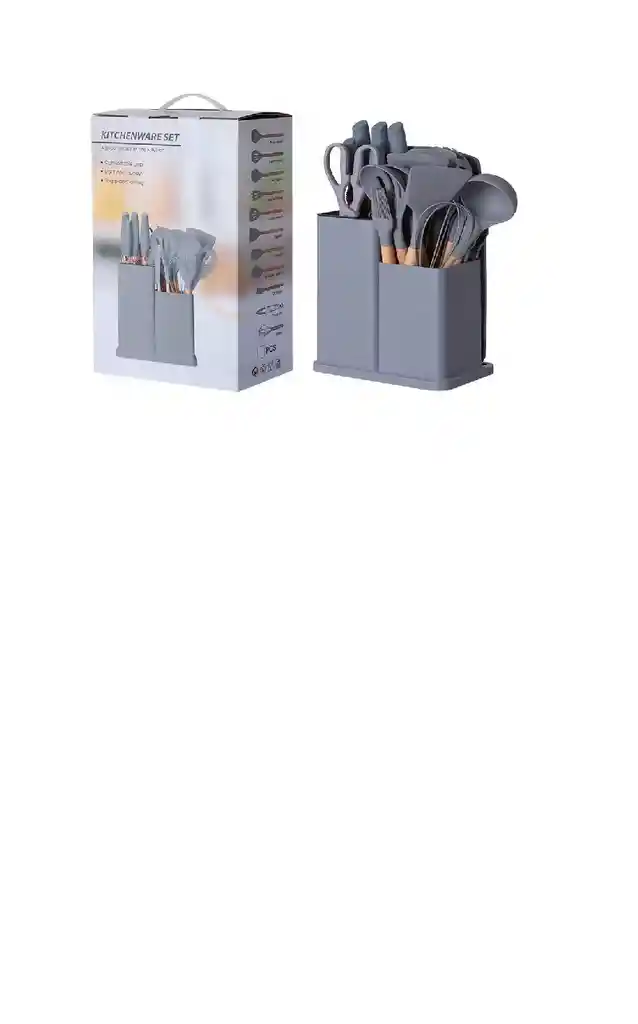 Material: silicona y madera. Contiene: 17 utensilios, una tabla y un porta utencilios