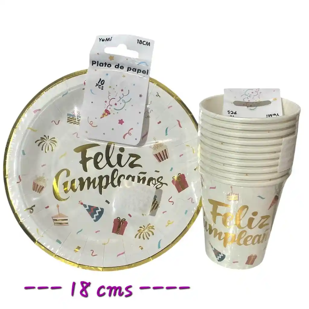 SET PLATOS CUMPLEAÑOS 10 VASOS 18 CMS EM CARTÓN , 10 PLATOS EN CARTÓN BIODEGRADABLE