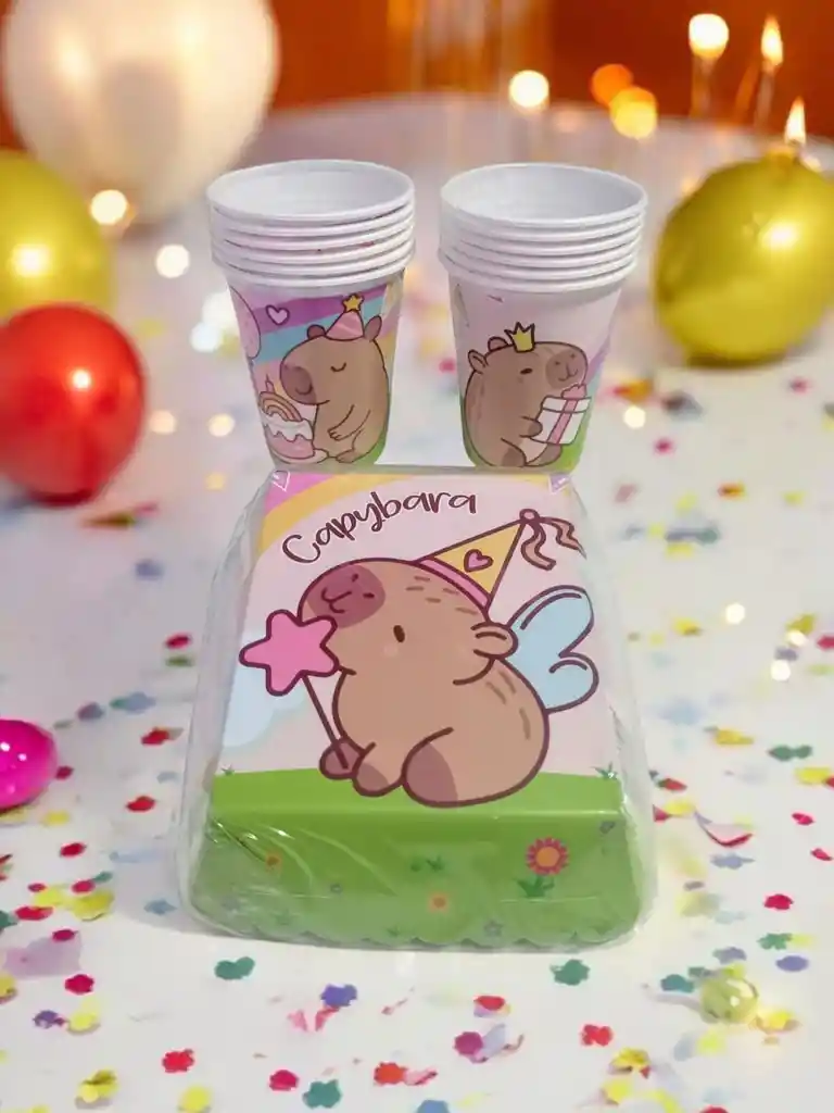¡Haz que la fiesta sea inolvidable con este encantador Set Capybara! Incluye 12 vasitos y 12 torteros con diseños coloridos y divertidos, perfectos para decorar mesas infantiles y servir postres o bebidas. Ideales para cumpleaños, reuniones escolares o cualquier celebración especial. ¡Prácticos, reutilizables y llenos de ternura!