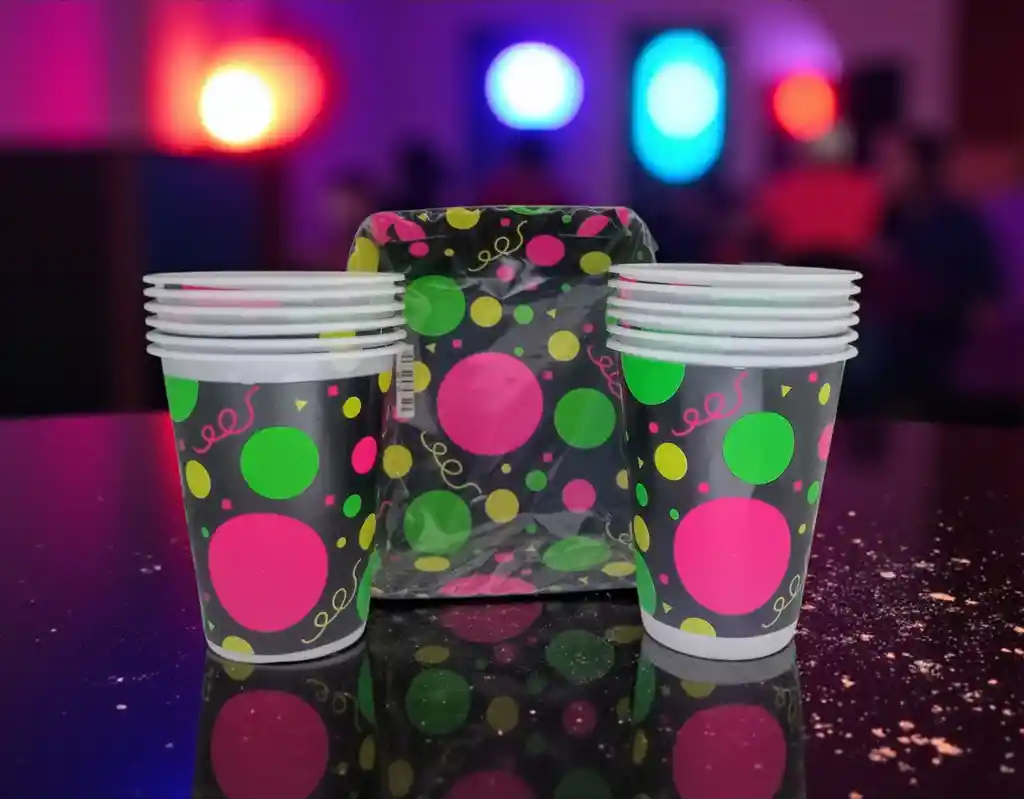 Dale un toque vibrante y divertido a tus celebraciones con este set de 12 vasos y 12 torteros en diseño neón sobre fondo negro. Perfectos para fiestas temáticas, cumpleaños y reuniones especiales, sus colores llamativos (fucsia, verde y amarillo) aportan energía y alegría a cualquier mesa. * Incluye solo vasos y torteros. Los demás elementos visibles en la foto son únicamente para ambientación.