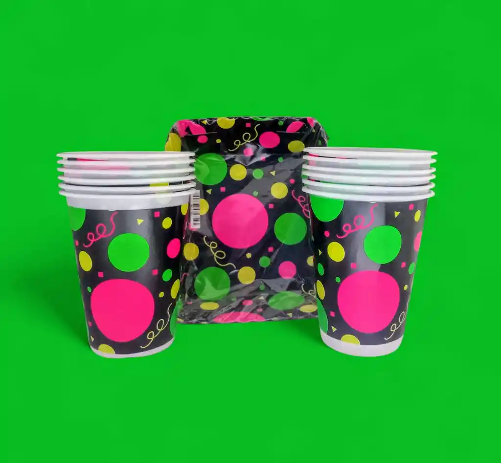 Dale un toque vibrante y divertido a tus celebraciones con este set de 12 vasos y 12 torteros en diseño neón sobre fondo negro. Perfectos para fiestas temáticas, cumpleaños y reuniones especiales, sus colores llamativos (fucsia, verde y amarillo) aportan energía y alegría a cualquier mesa. * Incluye solo vasos y torteros. Los demás elementos visibles en la foto son únicamente para ambientación.