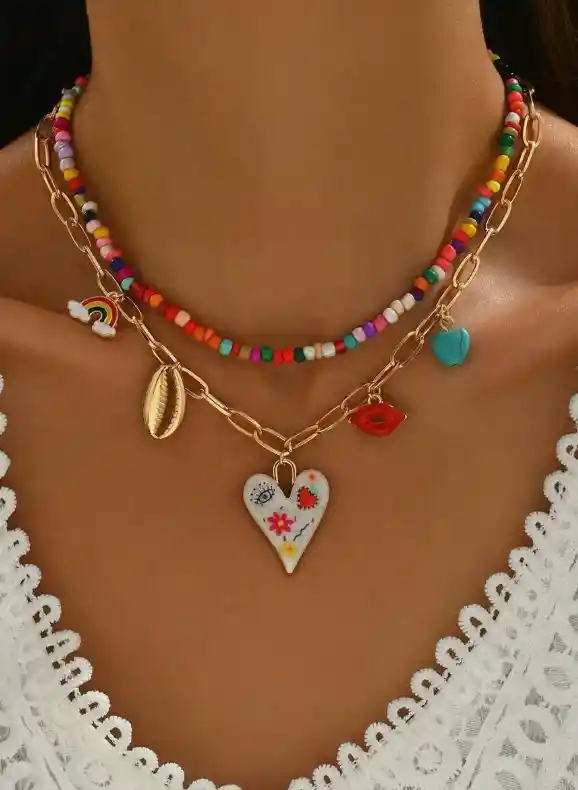 Set de 2 piezas de joyería divertida que incluye colgantes de corazón pintado de colores, labios rojos, concha, corazón arcoíris y turquesa verde con cadenas de cuentas de colores variados, adecuado para mujer para uso diario.