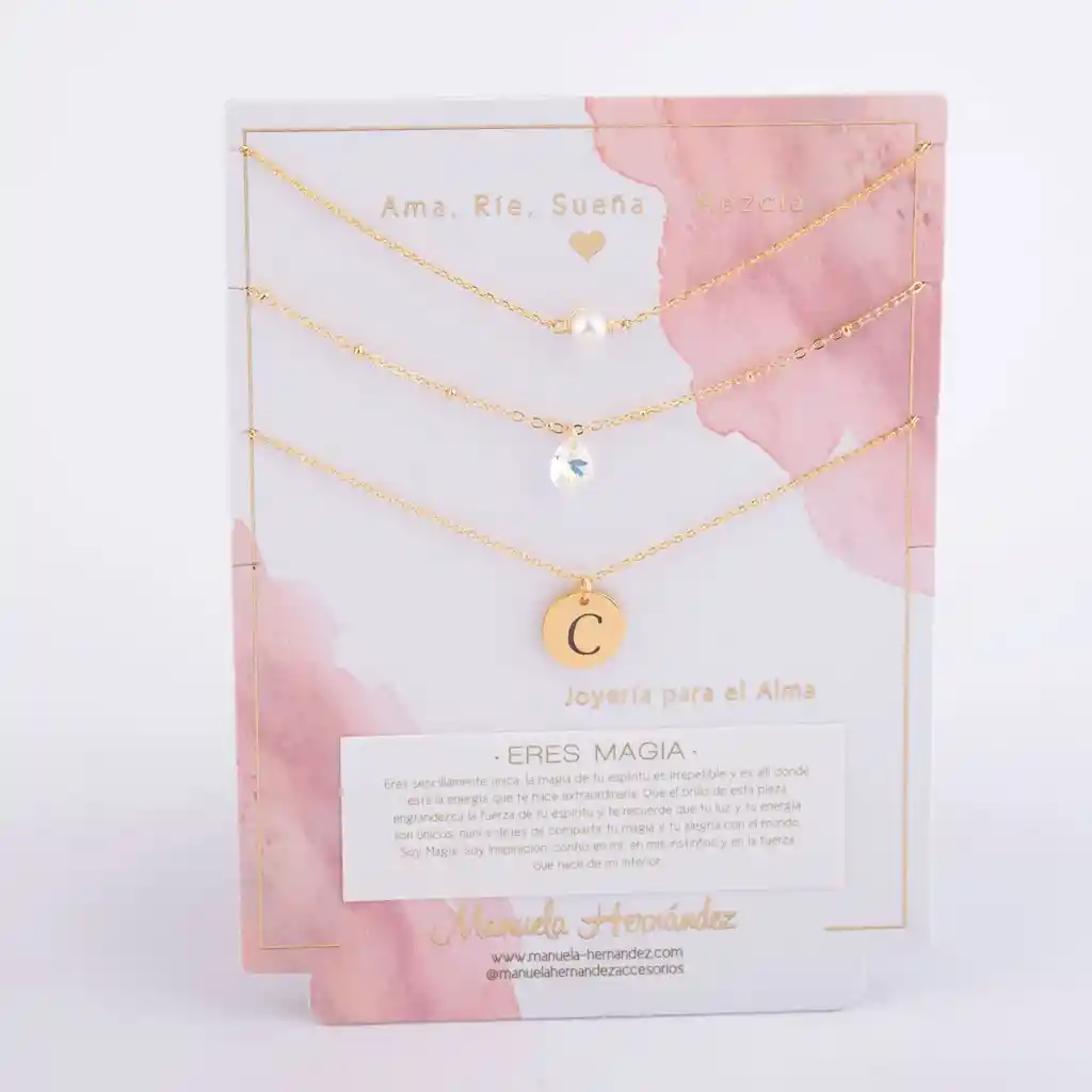 Este set de 3 collares en capas es un recordatorio suave y poderoso: eres magia. La perla, el cristal y tu inicial se alinean cerca del corazón para acompañarte todos los días, elevar tu energía y hacerte sentir única, luminosa y segura de lo que eres. ✨ Llévalo como amuleto o regálalo a alguien que amas: es de esos detalles que se vuelven ritual. *Características de tu Producto -Tipo: Set de 3 collares para layering. Este set es un Mix divino listo para llevar, donde cada pieza tiene la longitud perfecta para que te quede en capas y llevar un look súper poderoso. ¡Y lo mejor es que puedes utilizar los 3 collares juntos o por separado! -Diseño: -Collar 1: Cadena fina con perla natural cultivada (Longitud: 38cm + Extensión de 7.5cm) -Collar 2: cadena con cristal Swarovski certificado (Longitud: 40cm + Extensión de 7.5cm) -Collar 3: medalla con inicial (personalizable: eliges la letra) (Longitud: 45cm) -Estilo: Femenino, elegante y versátil ideal para usar juntos o por separado -Significado: Amor propio, brillo interior, identidad y confianza -Ideal para: Autoregalo, regalo para amigas/novia/mamá, cumpleaños, fechas especiales -Presentación: Tarjeta de marca con mensaje “Eres Magia” -Cuidado recomendado: Evita agua, perfumes y cremas guarda las piezas separadas para evitar enredos y proteger el cristal/perla. -Las cadenas y los apliques dorados cuentan con Baño de Oro 18k.