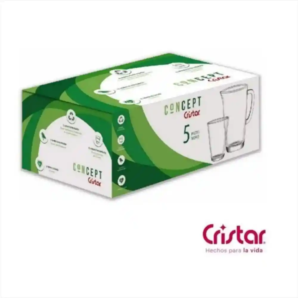 Set De 4 Vasos + 1 Jarra Cristar Vitro Concept, Estuche Por 5 Piezas Contenido:4 Vasos Vitro (12Oz, 359Ml) Diámetro 9,2Cm1 Jarra (50,7Oz, 1500Ml) Los Utensilios De Vidrio En Contacto Con Alimentos, Cumplen Con Los Requisitos Establecidos Por El Gobierno Nacional Para Prevenir Intoxicaciones Por Desprendimiento De Plomo Y Cadmio. Producto Hecho En Colombiavidrio 100% Reciclable, Ideal Para Todo Tipo De Bebida