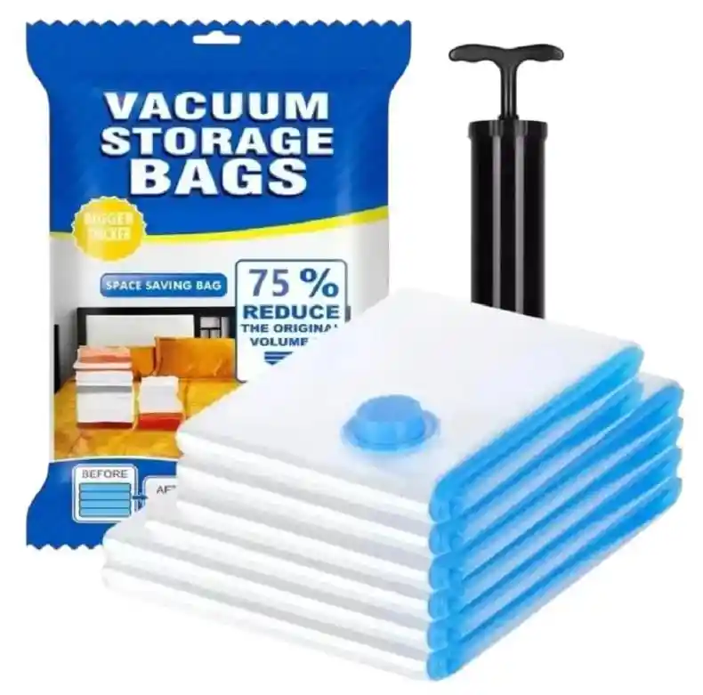 ¿Sientes que tu closet ya no tiene espacio para nada más? No es que necesites un armario más grande, necesitas optimizar el que ya tienes. Con nuestro Sistema de Compresión Pro, podrás reducir el volumen de tus prendas, cobijas y almohadas hasta en un 75%, ganando espacio que no sabías que existía. ¿Por qué este kit es indispensable en tu hogar? Adiós al Desorden: Imagina guardar 4 cobijas gruesas en el espacio de una sola. Ideal para cambios de temporada o para organizar ese "caos" en el maletero. Protección Total Blindada: Tus prendas favoritas quedarán selladas herméticamente contra el polvo, la humedad, los malos olores y polillas. Al sacarlas, estarán como nuevas. Elasticidad Extrema: Fabricadas con polímeros de alta resistencia que permiten estirarse sin romperse, garantizando que puedas usarlas una y otra vez en cada mudanza o viaje. Independencia Total: El kit incluye una bomba manual de succión, lo que significa que no necesitas una aspiradora eléctrica para usarlas. ¡Llévalas en tu maleta de viaje y comprime tu ropa también al regresar!