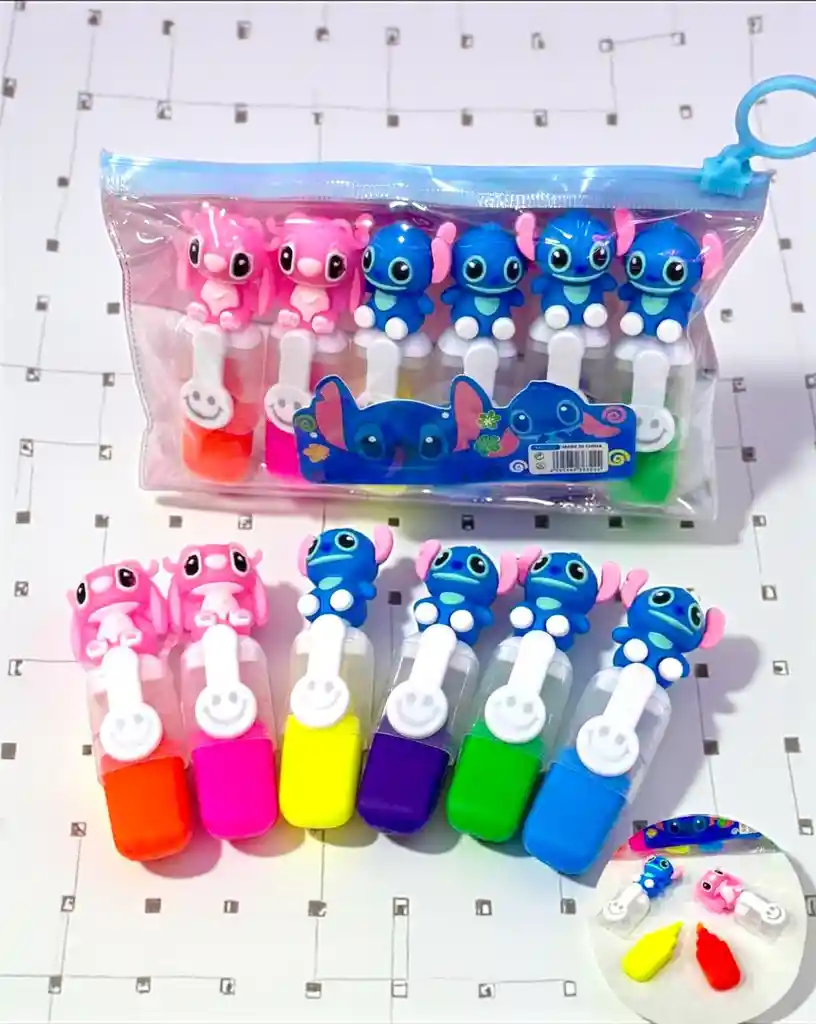 Estos son resaltadores (marcatextos) con temática de Stitch. El set incluye 6 mini resaltadores en colores fluorescentes. Cada resaltador presenta un diseño único y divertido del personaje en la tapa, en 3D. Vienen en un estuche de PVC transparente para su almacenamiento. Son ideales para resaltar textos, tomar apuntes o para coleccionar