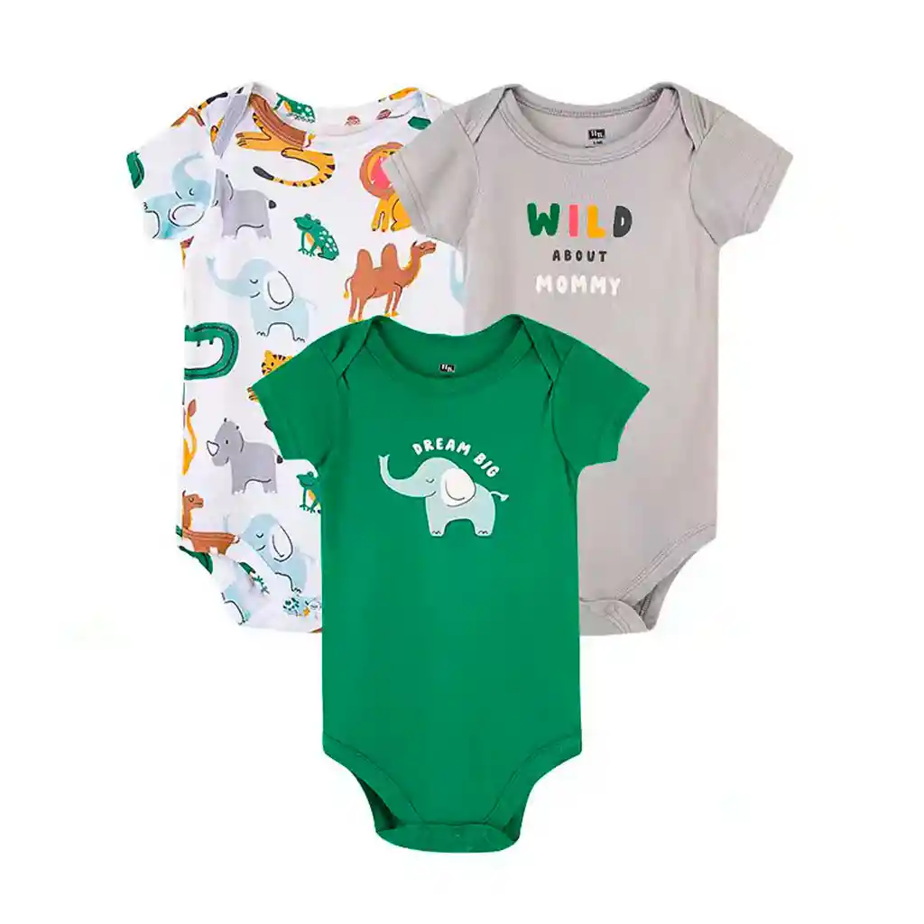 Set De 9 A 12 Meses De Mamelucos X3 Wild Animales, Paquete De Tres Mamelucos De Manga Corta, Con Diferentes Diseños Y Colores, Tela Transpirable Y Antialérgica - Hudson Baby