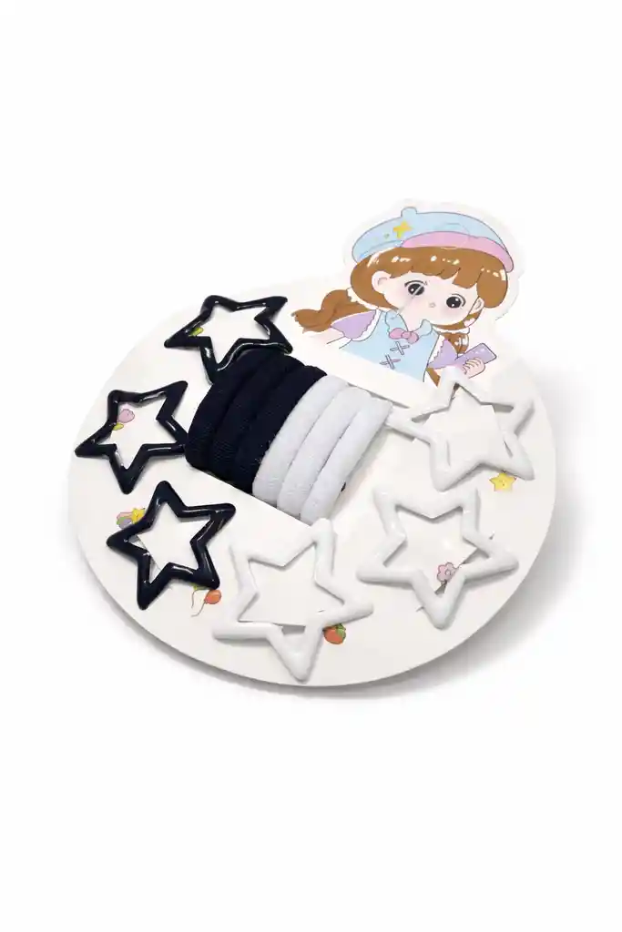 Set de Accesorios para Cabello – Estrellas Lindo set de accesorios para el cabello con diseño de estrellas, perfecto para niñas. Incluye ligas elásticas y ganchos decorativos que ayudan a crear peinados prácticos y divertidos para el día a día. ✨ Características: Incluye ligas elásticas para el cabello Ganchos con diseño de estrellas Colores combinados blanco y azul oscuro Ideales para peinados infantiles Material resistente y cómodo de usar 🎀 Perfecto para uso diario, colegio, salidas o como detalle para niñas. 📦 Se vende el set completo 📌 Colores y diseños según disponibilidad
