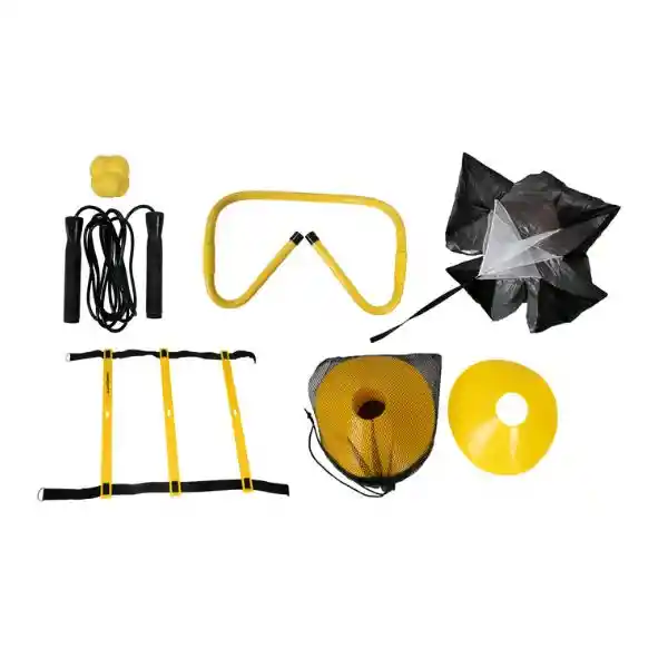 Set de agilidad compuesto por: * 20 conos * Paracaídas de velocidad material impermeable, poliéster, tamaño 48 * Escalera tamaño 3m * Bola de reacción de agilidad tamaño 6.5x6.5x6.5 cm * 4 piezas de obstáculos de agilidad ajustables tamaño de 6y 12 * Cuerda de saltar de PVC con mango de espuma tamaño 275 * 0.6cm.