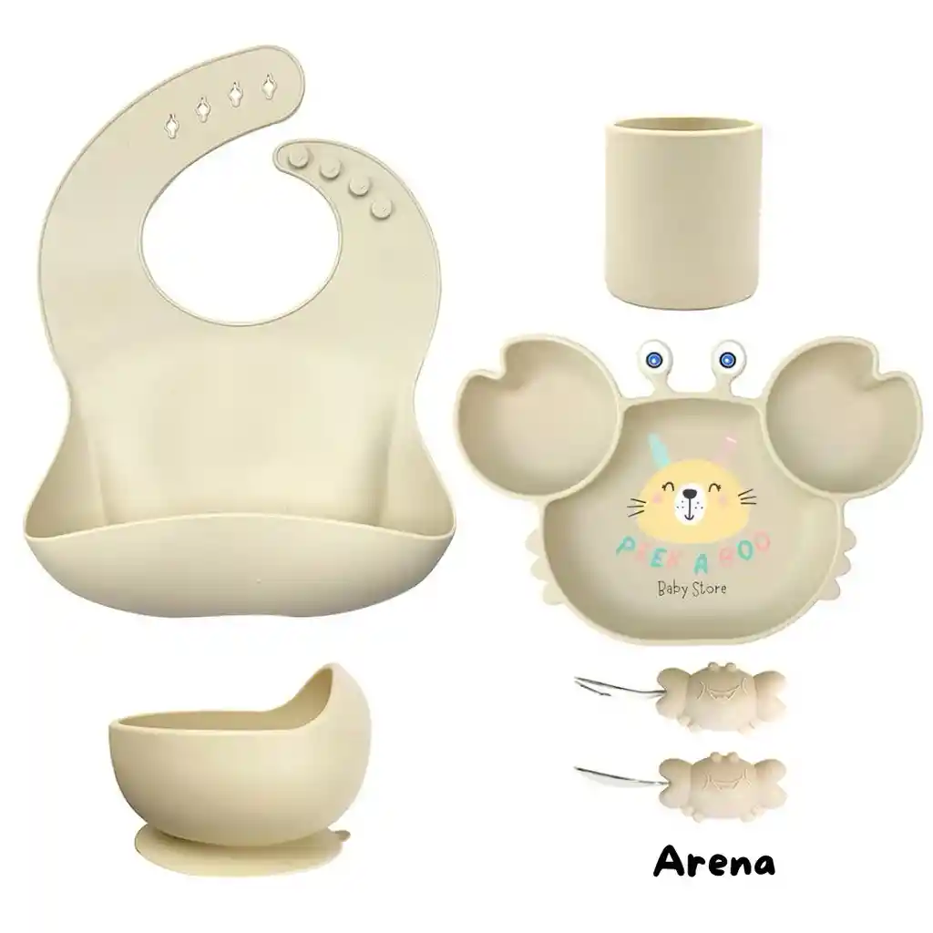 Set de Alimentación Infantil de Silicona – Completo y Seguro Este set de alimentación es ideal para bebés y niños en etapa de alimentación independiente. Fabricado en silicona de grado alimenticio y libre de BPA, garantiza seguridad, comodidad y facilidad de uso en cada comida. Beneficios del producto: Material seguro y duradero: Hecho de silicona de grado alimenticio, libre de BPA, resistente y flexible. Diseño ergonómico: Adaptado para facilitar la alimentación de los más pequeños, fomentando su autonomía. Fácil de limpiar: Apto para lavavajillas y resistente a manchas y olores. Antiderrames y práctico: El cuenco de succión se adhiere a la mesa para evitar derrames y facilitar la alimentación sin desorden. Incluye: Babero de silicona ajustable con bolsillo recolector. Plato en forma de cangrejo, diseñado para hacer la comida más divertida. Tazón de succión para mayor estabilidad. Cuchara y tenedor adaptados para manos pequeñas. Vaso de boca ancha, fácil de sujetar y usar. Este conjunto es perfecto para acompañar la transición a la alimentación independiente, brindando comodidad, higiene y diversión en cada comida.