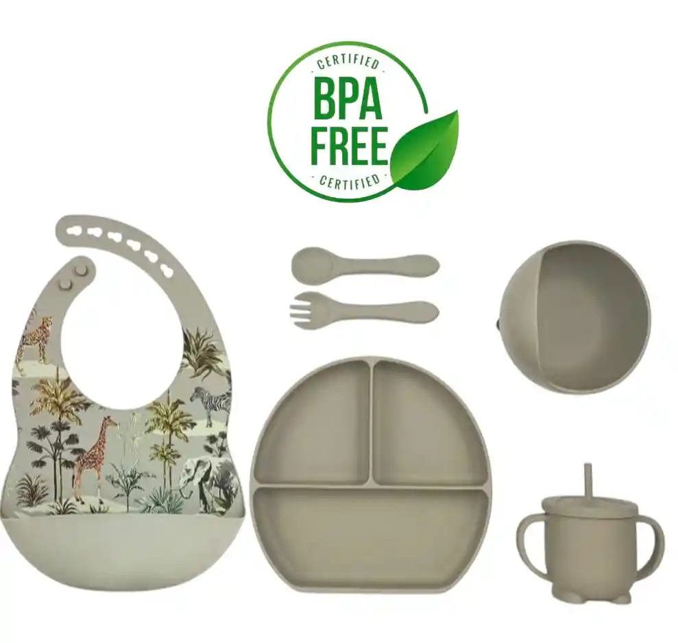 Set de alimentación complementaria de 6 piezas diseñado para acompañar a bebés en la transición hacia la comida sólida. Fabricado con materiales seguros y libres de BPA, ideal para facilitar la alimentación diaria de forma cómoda, práctica y segura. Características principales: Incluye plato, bowl, vaso con tapa, cuchara, tenedor y babero. Material de silicona o plástico de grado alimenticio, libre de BPA y ftalatos. Superficie suave y bordes redondeados para mayor seguridad. Diseño ergonómico adaptado a manos pequeñas. Colores atractivos que estimulan el interés del bebé por la comida. Fácil de lavar, apto para lavavajillas (según indicaciones del fabricante). Beneficios de uso: Facilita la autonomía del bebé en la etapa de alimentación complementaria. Promueve la coordinación mano-boca y la motricidad fina. Material seguro y resistente, pensado para el uso diario. Ideal para uso en casa o fuera de ella. Especificaciones técnicas: Material: silicona y/o plástico de grado alimenticio. Edad recomendada: desde 6 meses en adelante. Piezas: 6 unidades. Contenido del paquete: 1 plato. 1 bowl. 1 vaso con tapa. 1 cuchara. 1 tenedor. 1 babero. Recomendaciones de uso: Lavar antes del primer uso. Supervisar siempre al bebé durante la alimentación. No exponer a fuentes de calor directo.
