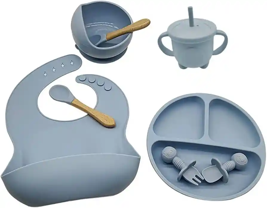 Este kit completo de 8 piezas es el aliado perfecto para iniciar la alimentación complementaria (BLW), diseñado para dar seguridad a tu bebé y tranquilidad a ti. Contiene: Plato con divisiones y ventosa Bowl con succión Babero ajustable Vaso de entrenamiento 4 Cubiertos ergonómicos Colores disponibles: Rosado, Azul, Morado, Gris, Verde, Beige