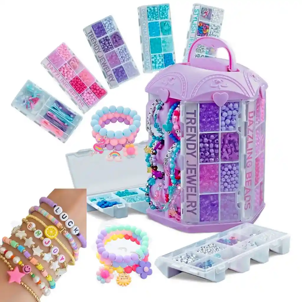 Set De Armar Pulseras Bisutería Estuche Juguete Niñas 5 En 1. CARACTERISTICAS: * Set De Armar Pulseras Bisutería Estuche Juguete. * El estuche incluye todo lo necesario para crear joyas únicas y personalizadas. * Promueve la coordinación y la concentración creando piezas únicas * Con un enfoque en el aprendizaje a través del juego. * Diseño en forma de torre con compartimientos para organizar las diferentes piezas. * Fácil de transportar cuenta con una manija para llevarla donde desees. * Contiene 1600 Piezas. * - Este producto trae un practico estuche en forma de torre con compartimientos para bolas y pedrería de diferentes diseños, tamaños y colores, además cuenta con lazos para el armado de la bisutería. Permitiendo que se mantenga el orden en el momento de armar sus diseños. ESPECIFICACIONES: * Material: Plástico * Medidas: Ancho: 10 x Largo: 25 x Alto: 10 cm. * Contiene: 1600 Piezas (pedrería/lazos ).